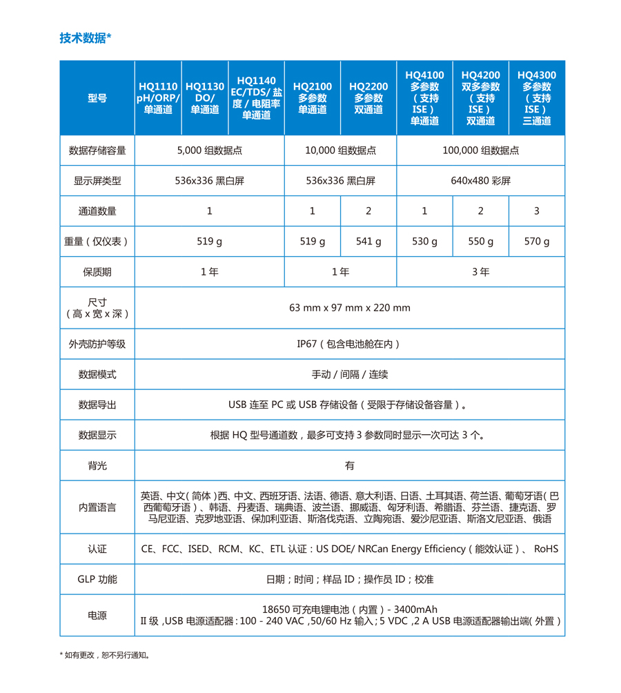 pH / ORP DO EC / TDS 多參數(shù)* 多參數(shù)* 多參數(shù) 多參數(shù) 多參數(shù)