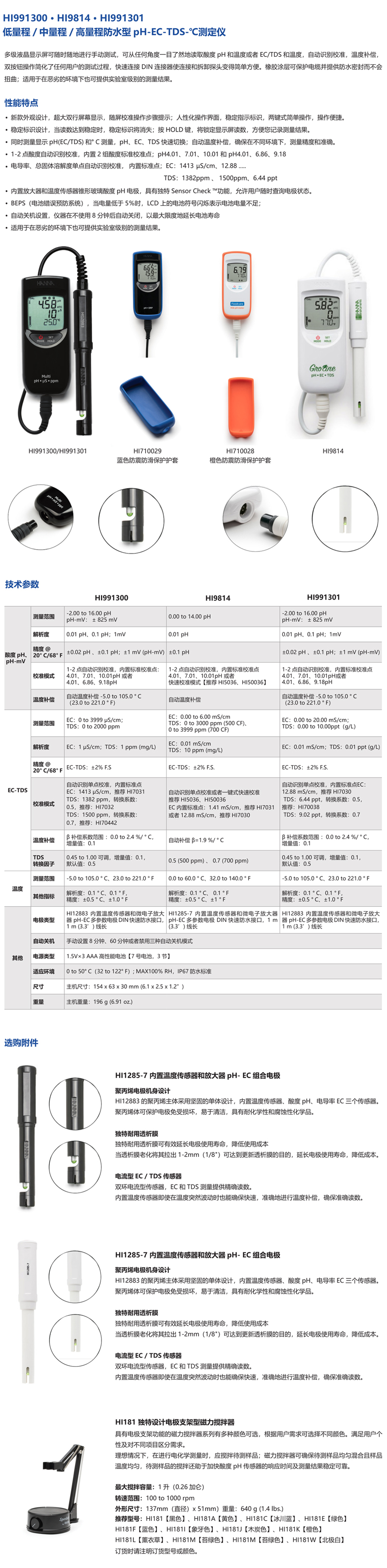 多級液晶顯示屏可隨時隨地進行手動測試,可從任何角度一目了然地讀取酸度pH和溫度  或者EC/TDS和溫度,自動識別校準,溫度補償,雙按鈕操作簡化了任何用戶的測試過程,快速連接DIN連接器使連接和拆卸探頭變得簡單方便。橡膠涂層可保護電纜并提供防水密封而不會扭曲;適用于在惡劣的環(huán)境下也可提供實驗室級別的測量結(jié)果