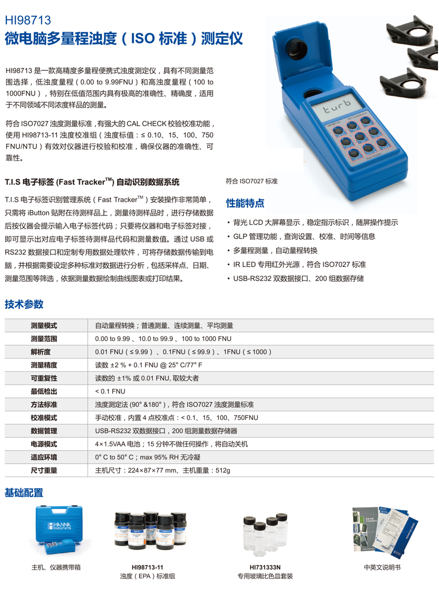 主機(jī),HI98713-11 定制專用濁度(ISO)標(biāo)準(zhǔn)組(標(biāo)值@25°C:≤ 0.1、15、100、750 FNU),HI731333N 專用玻璃比色皿套裝,HI93703-58 玻璃比色杯潤滑劑,HI920005 T.I.S電子標(biāo)簽(5個),HI710006 AC230V/12VDC 電源適配器,中英文使用說明書,HI710134 定制專用儀器攜帶箱【溫馨提示:建議訂購HI93703-50比色皿清潔液和HI731318玻璃比色皿清潔布,用于玻璃比色皿清潔修復(fù),確保測量精度和讀數(shù)準(zhǔn)確度】