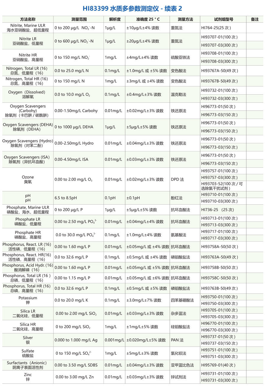 Br、碘、磷P、CuFe、Ca、MgMn、AI、Ni、Mo、K、Ag、Zn、堿度、余氯【游離氯】、總氯、氨氮總氮N、總磷P、聯(lián)氨N2H4臭氧O3、酸度pH、氯化物、氰尿酸、氟化物、總硬度、鈣硬度、鎂硬度、溶解氧O2除氧劑、六價(jià)鉻Cr、磷酸鹽、硫酸鹽、硝酸鹽【氮】 、二氧化氯二氧化硅、鉑鈷色度、硝酸鹽【氮】 、化學(xué)需氧量COD、陰離子表面活性劑SDBS、吸光度【Abs】等水質(zhì)指標(biāo)快速精確測量。