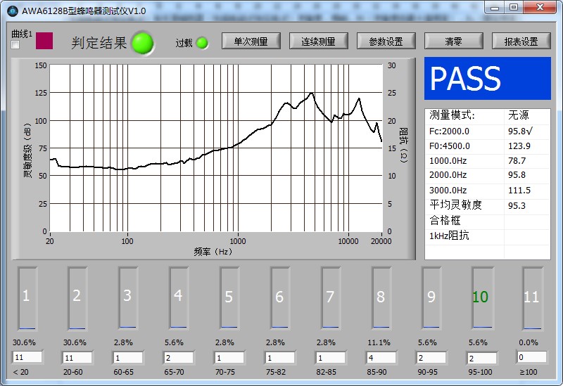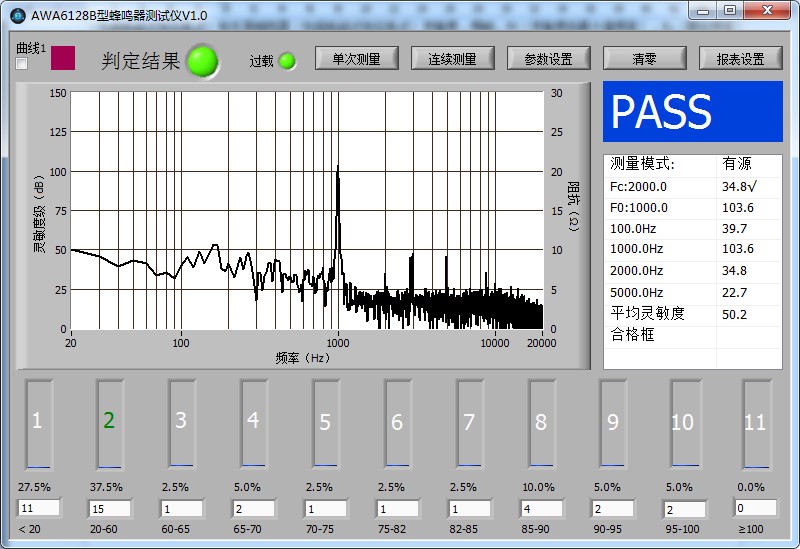 蜂鳴器測試儀是專用于蜂鳴器電聲特性測試的儀器。測試儀可以測試包括有源(包括電磁式和壓電式)和無源(包括電磁式和壓電式)兩種類型的蜂鳴器電聲指標。有源蜂鳴器通過輸入蜂鳴器的直流電壓,并選擇輸出方式,在主界面上會顯示在一段頻率范圍內的頻譜曲線,同時在右邊的結果顯示框中顯示最高點的頻率及靈敏度級,蜂鳴器出廠的額定頻率及對應的靈敏度級(頻率可以在參數(shù)設置界面自行輸入)。無源蜂鳴器通過輸入信號幅度,并可以自定義輸出的頻率范圍,在所定義的頻率范圍內輸出頻響曲線。同時可以顯示平均靈敏度,諧波失真,阻抗及曲線最高點的頻率及相對應的靈敏度級,同時還可以顯示出廠額定頻率及對應的靈敏度級。測試結束后,根據(jù)自定義的標準,簡潔直觀的顯示 PASS/FAIL,自動判斷是否合格??梢院妥詣臃诌x機臺配合使用,自動判斷是否合格,進行產(chǎn)品分檔,極大的提高了測試效率。